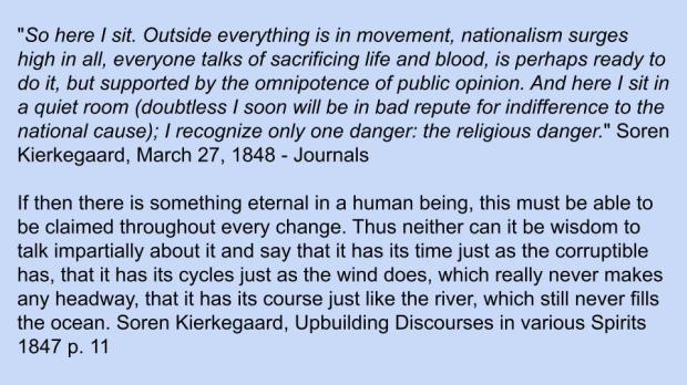 Kierkegaard’s first chapter deals once again with the eternal in man. He was concerned with the possibility of the loss of the eternal in the single individual. “Only the Eternal is always appropriate and always present, is always true. Only the Eternal applies to each human being, whatever his age may be. … If there is, then, something eternal in a man, it must be able to exist and to be grasped within every change. … There is a battle of despair that struggles — with the consequences. The enemy attacks constantly from behind, and yet the fighter shall continue to advance.”