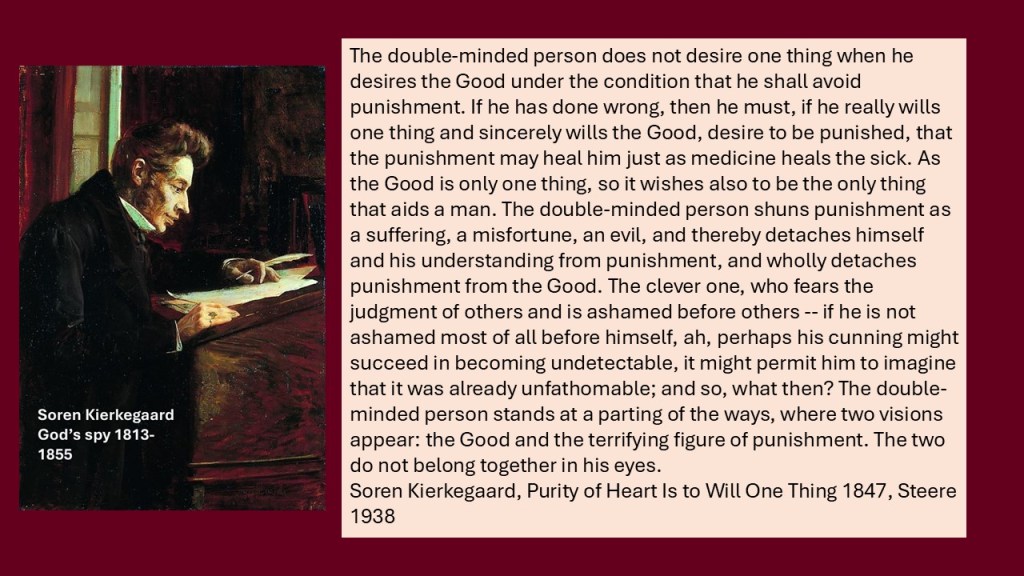 “The Good without condition and without qualification, without preface and without compromise is, absolutely the only thing that a man may and should will, and is only one thing.” But the man who wills the Good for the sake of reward does not will one thing, but is double-minded. “The double-minded man stands at a parting of the ways, and sees there two apparitions: the Good, and the Good in its victory, or even in its victory through him.” … “the double-minded person, then, may have a feeling — a living feeling for the Good. If someone should speak of the Good, especially if it were done in a poetical fashion, then he is quickly moved, easily stimulated to melt away in emotion.“