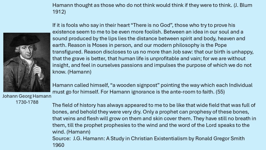 That God in incomprehensible reconciling grace lowers himself (has entered into human life, Dasein, as Kierkegaard says) is central alike for Kierkegaard and for Hamann. For Hamann it is also, and precisely, the world which God enters, but for Kierkegaard the place of this event is solely the individual. J G Hamann 1730 1788 A Study In Christian Existence by Ronald Gregor Smith 1960