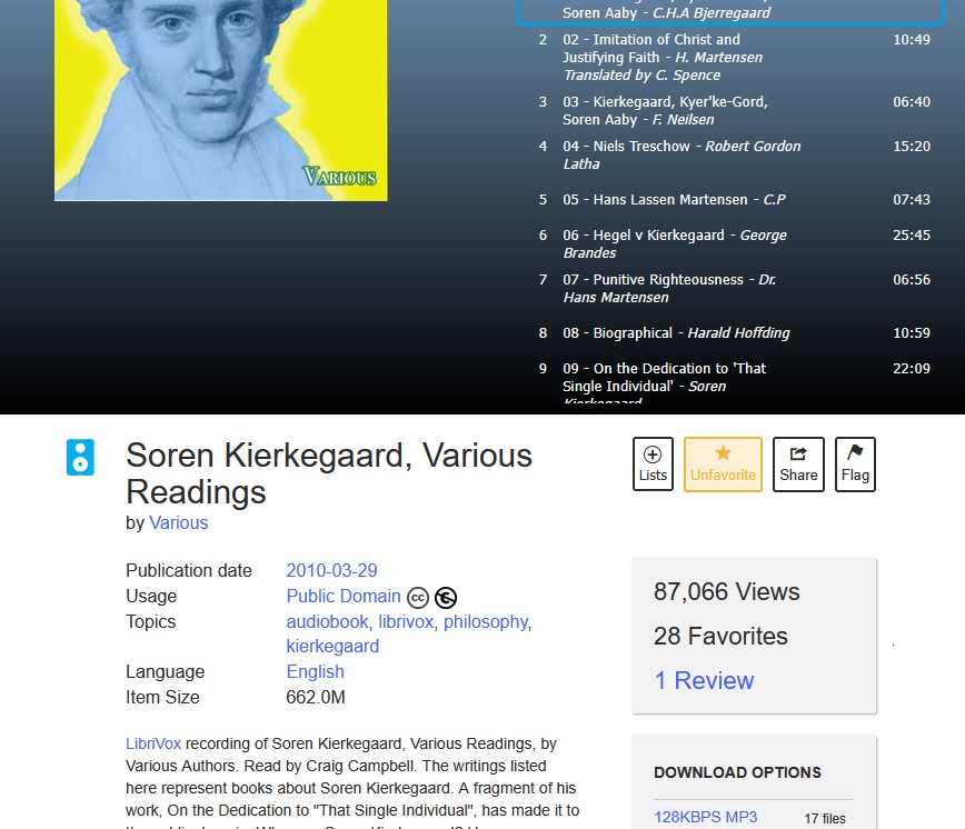 You can read Soren Kierkegaard at librivox