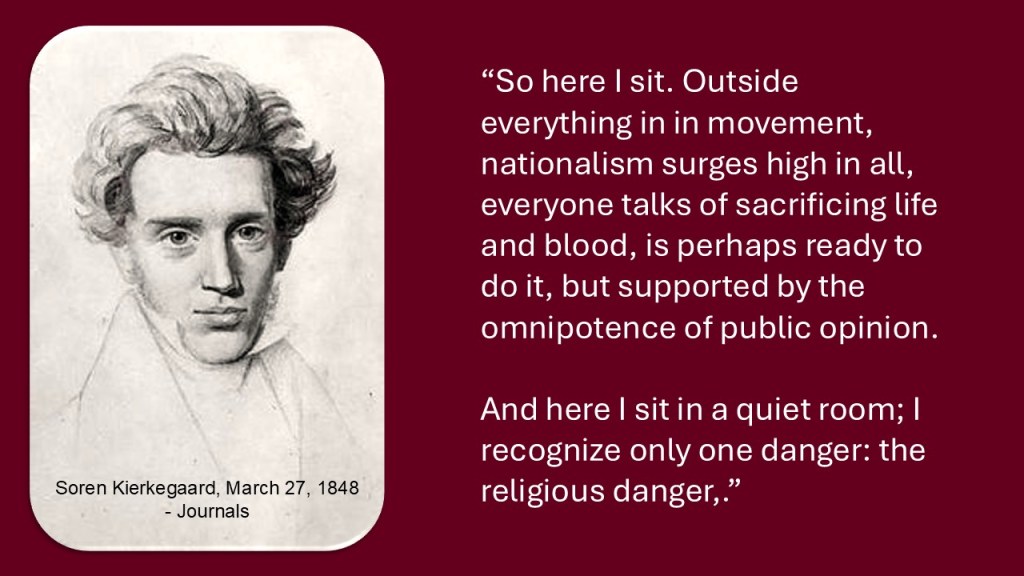 Gregor Malantschuk delivered four lectures to the Soren Kierkegaard Society in Copenhagen in 1951 and published Kierkegaard’s Way to the Truth in 1963 where he said, “It is certainly noteworthy that Kierkegaard’s challenge in Works of Love (September 29, 1847) to solve all problems by self-renunciation appeared only a few months before another challenge to solve all social problems by force – the Communist Manifesto of Karl Marx, which was published in February, 1848. Kierkegaard and Marx toss out to the world their totally opposite views on the solution of life’s problems. Kierkegaard’s Way to Truth by Gregor Malantschuk 1963 Augsburg Publishing House