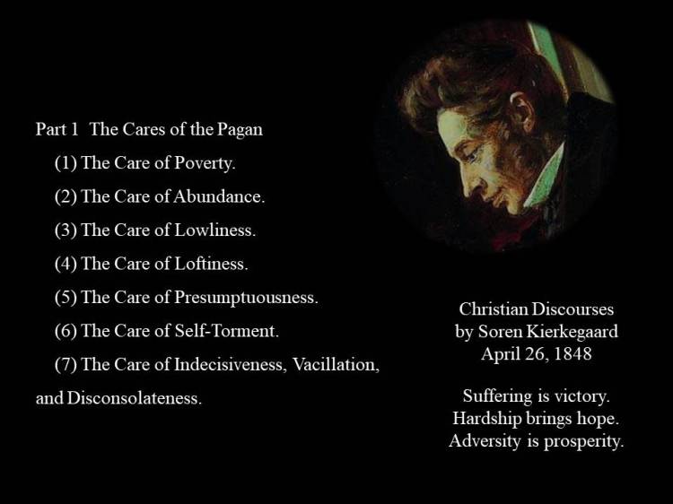 Part I takes the reader through the cares of life. One person lives in poverty and another in abundance. Christ said not to worry about what you will eat or drink so the Christian prays to God for daily bread but the pagan knows nothing of this and asks what shall we eat today, what shall we eat tomorrow, what shall we eat next year. The bird, like Socrates, is a teacher of ignorance. The bird doesn’t gather its riches and is therefore ignorant of having abundance. The Christian might have abundance but acts as though he is ignorant of having it. The rich pagan knows all about his wealth and is always thinking about it. “Christianity has never taught that literally to be a lowly person is synonymous with being a Christian, nor that there is a direct and inevitable transition from literally being a lowly person and becoming a Christian; neither has it taught that if the worldly eminent person relinquished all his power he therefore was a Christian.” (Christian Discourses p. 54-55 – a page number means the quote was from Christian Discourses)