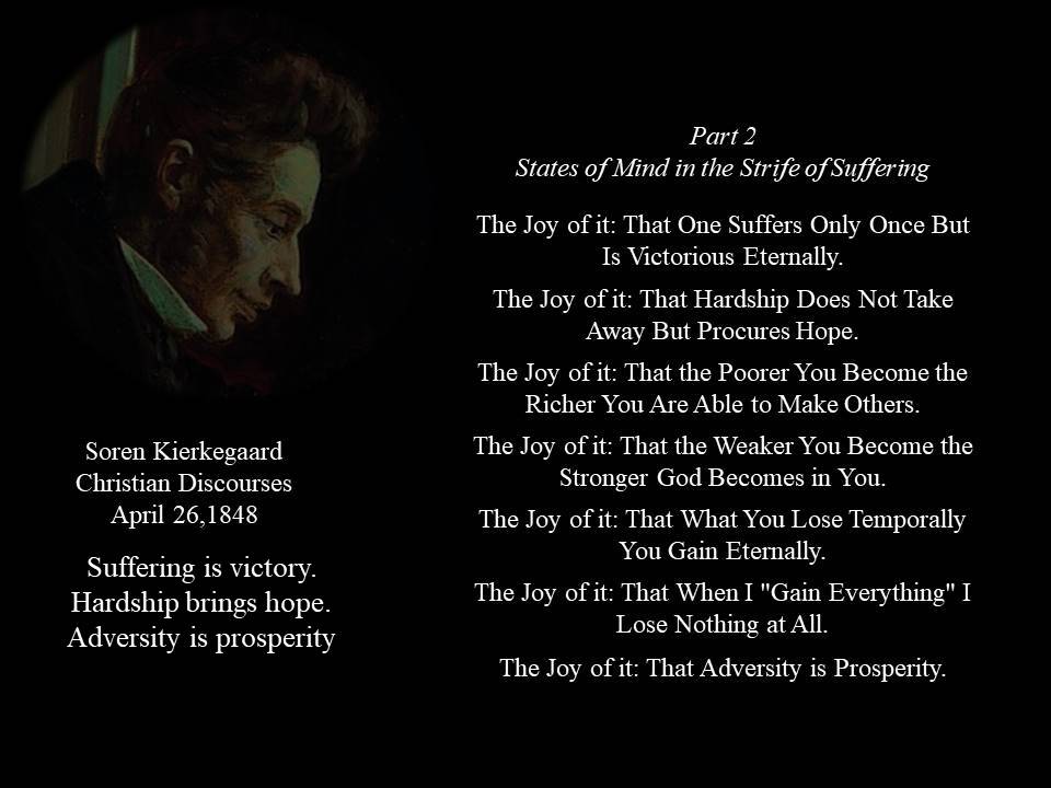 Suffering, hardship and adversity are a common theme in part 2 of Kierkegaard’s discourses. The Christian has to learn to look at everything turned around. Adversity is prosperity. Suffering is victory. Hardship brings hope. You become rich by becoming poor and strong through your own weakness. (Sounds like Brave New World).
