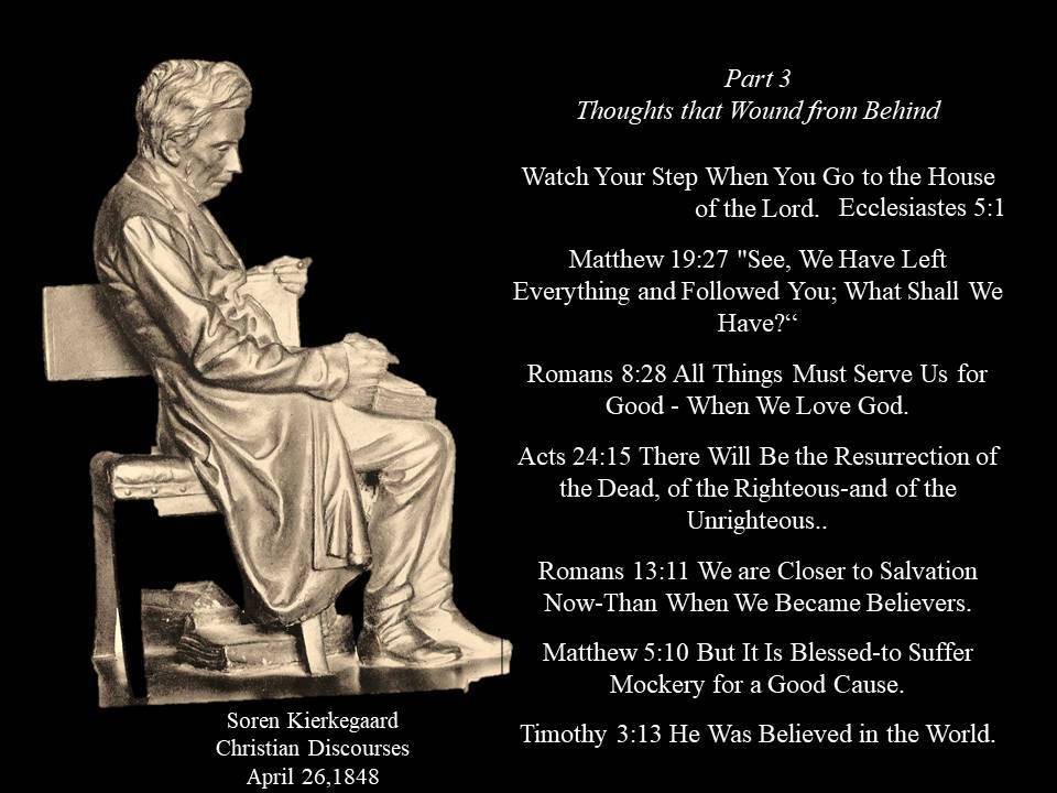 Kierkegaard has written four parts to his book, each with seven discourses on Biblical texts. Denmark was a Christian nation. Kierkegaard makes a distinction between Christianity and Christendom. The single individual is a Christian but many single individuals, such as everyone in Denmark, as a Christian nation, where everyone must be born a Christian and baptized as an infant and be a Christian, is Christendom. The difference is choice. “No one can serve two masters. Either you will hate the one and love the other, or you will be devoted to the one and despise the other” Matthew 6:24. The birds of the air and the lily of the field are compared with the Christian and the pagan in the first section of Christian Discourses. In Part II he talks about the hardships of life and how they are really for your good. Part III is titled “Thoughts That Wound From Behind.” And Part IV is designed for the Christian who is coming before God at the Communion table for the forgiveness of sins.