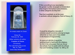 Søren Kierkegaard was a Christian author who was against applying the ideas of the Scientific Enlightenment to Christianity. He lived in Denmark from 1813 to 1855. His works were written to the single individual who might be interested in reading them. He was against Christian nationalism.
