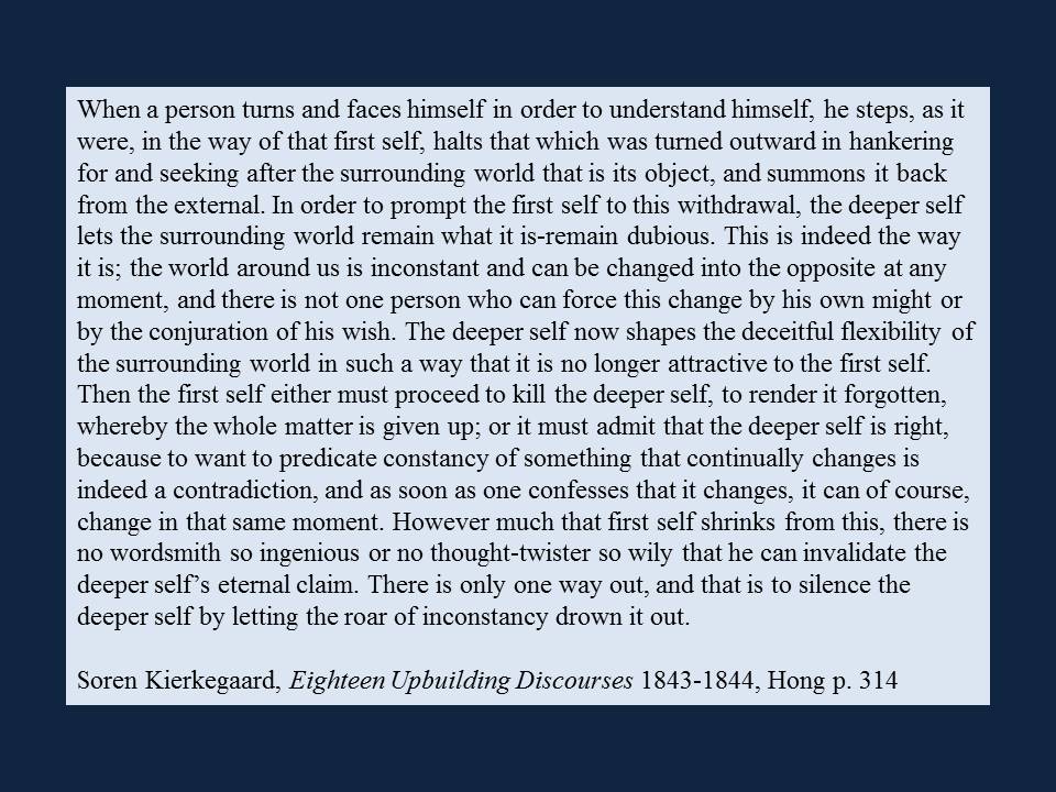 Søren Kierkegaard was a Christian author who was against applying the ideas of the Scientific Enlightenment to Christianity. He lived in Denmark from 1813 to 1855. His works were written to the single individual who might be interested in reading them. He was against Christian nationalism.