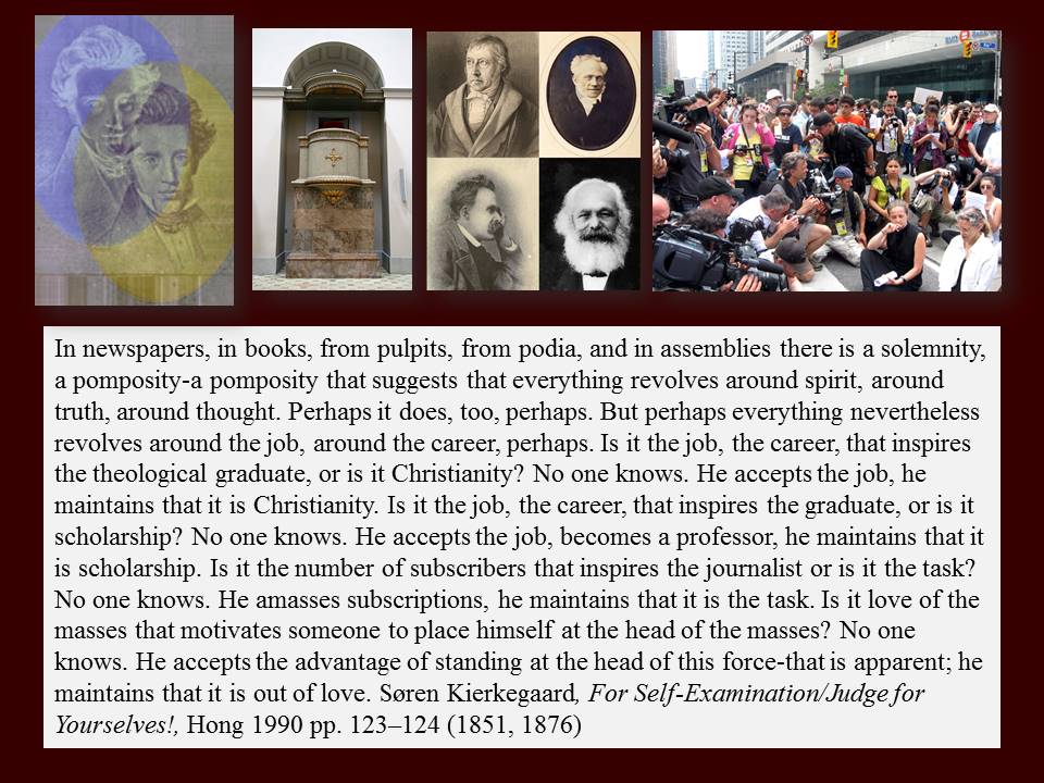 Søren Kierkegaard was a Christian author who was against applying the ideas of the Scientific Enlightenment to Christianity. He lived in Denmark from 1813 to 1855. His works were written to the single individual who might be interested in reading them. He was against Christian nationalism.