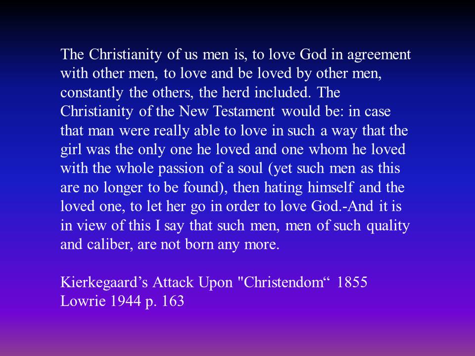 Søren Kierkegaard was a Christian author who was against applying the ideas of the Scientific Enlightenment to Christianity. He lived in Denmark from 1813 to 1855. His works were written to the single individual who might be interested in reading them. He was against Christian nationalism.