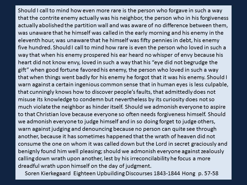 Søren Kierkegaard was a Christian author who was against applying the ideas of the Scientific Enlightenment to Christianity. He lived in Denmark from 1813 to 1855. His works were written to the single individual who might be interested in reading them. He was against Christian nationalism.
