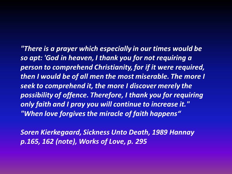 Søren Kierkegaard was a Christian author who was against applying the ideas of the Scientific Enlightenment to Christianity. He lived in Denmark from 1813 to 1855. His works were written to the single individual who might be interested in reading them. He was against Christian nationalism.