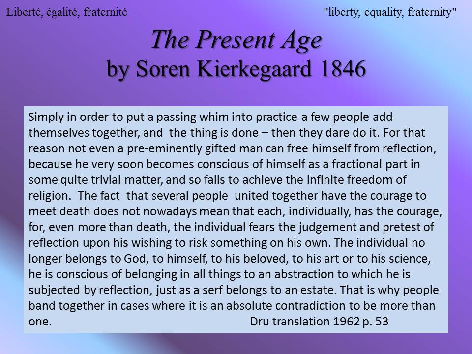 Søren Kierkegaard was a Christian author who was against applying the ideas of the Scientific Enlightenment to Christianity. He lived in Denmark from 1813 to 1855. His works were written to the single individual who might be interested in reading them. He was against Christian nationalism.