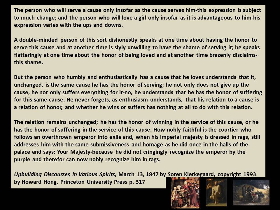 Søren Kierkegaard was a Christian author who was against applying the ideas of the Scientific Enlightenment to Christianity. He lived in Denmark from 1813 to 1855. His works were written to the single individual who might be interested in reading them. He was against Christian nationalism.