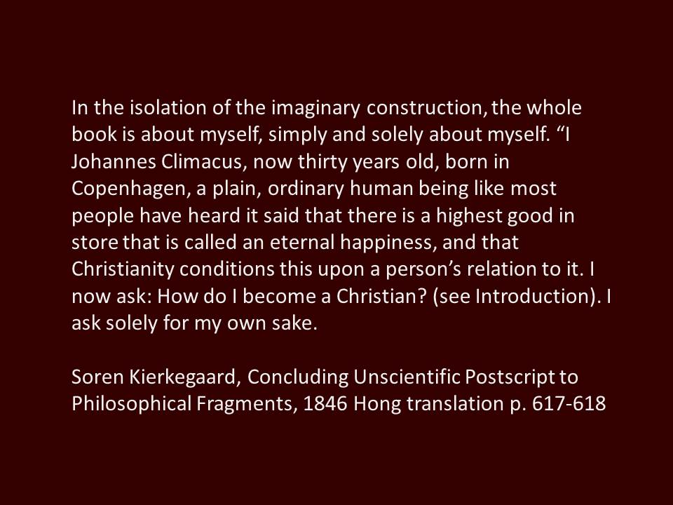 Søren Kierkegaard was a Christian author who was against applying the ideas of the Scientific Enlightenment to Christianity. He lived in Denmark from 1813 to 1855. His works were written to the single individual who might be interested in reading them. He was against Christian nationalism.