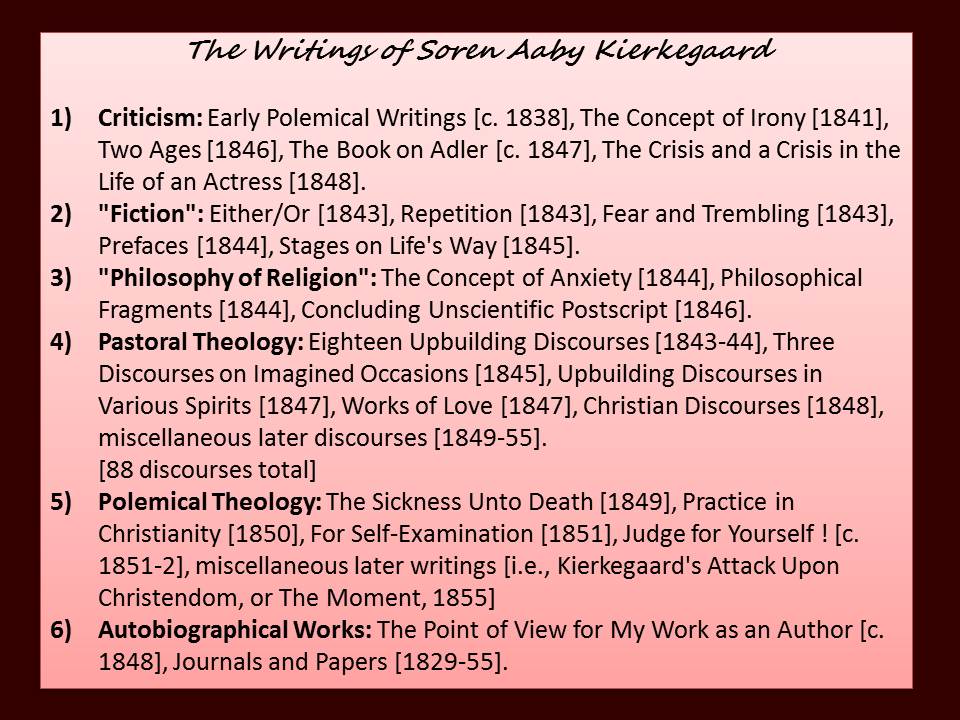 Søren Kierkegaard was a Christian author who was against applying the ideas of the Scientific Enlightenment to Christianity. He lived in Denmark from 1813 to 1855. His works were written to the single individual who might be interested in reading them. He was against Christian nationalism.