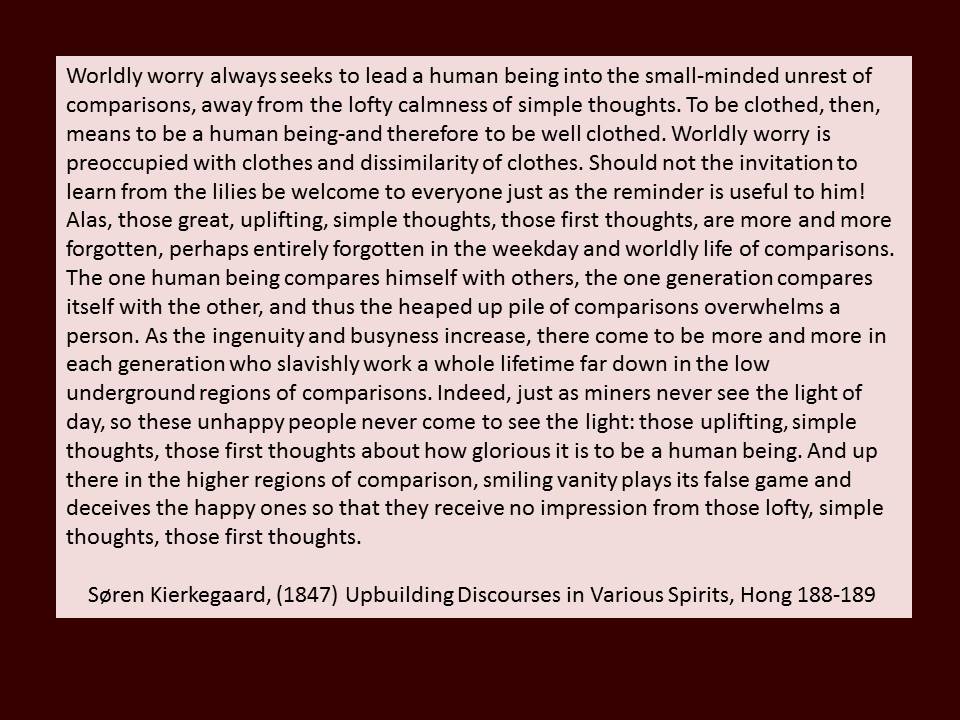 Søren Kierkegaard was a Christian author who was against applying the ideas of the Scientific Enlightenment to Christianity. He lived in Denmark from 1813 to 1855. His works were written to the single individual who might be interested in reading them. He was against Christian nationalism.